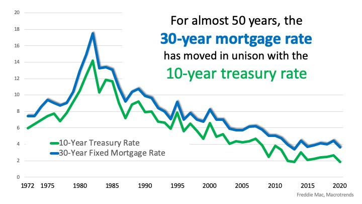 The yield from treasury bonds is the rate investors receive when they purchase the bond. Historically, when the treasury rate moves up or down, the 30-year mortgage rate follows. Here’s a powerful graph showing the relationship between the two over the last 48 years: